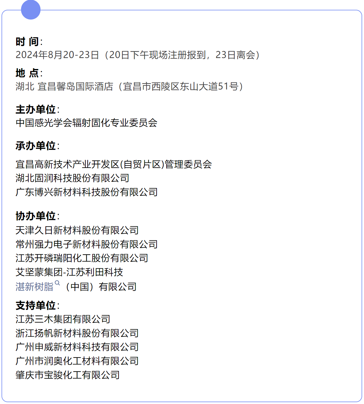 为促进辐射固化技术及产业的交流与合作,展示行业最新研究及应用成果,促进上下游产业链交流与合作,探讨辐射固化及相关领域的最新前沿和发展趋势,助力绿色环保科技和经济的发展,中国感光学会辐射固化专业委员会拟于2024年8月20-23日(20日现场注册报到)在湖北 宜昌市 宜昌馨岛国际酒店主办召开“2024第二十五届辐射固化年会”。本次年会将邀请相关部门、行业泰斗、知名专家学者、企业家及代表共同出席。